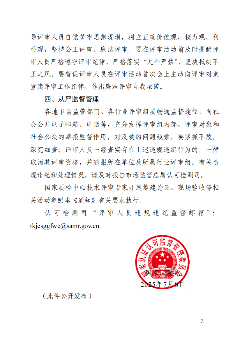 检验检测机构资质认定评审工作纪律迎来最严要求!近日,国家认证认可监督管理委员会(国家认监委)正式发布《关于进一步严肃检验检测机构资质认定评审工作纪律的通知》(国认监函[2025]6号),剑指评审环节的违规违纪行为,明确划出“九个严禁”的红线,旨在构建公正、权威、高效、廉洁的评审秩序。这对规范行业准入、提升评审公信力意义重大,各相关机构及人员务必高度重视!