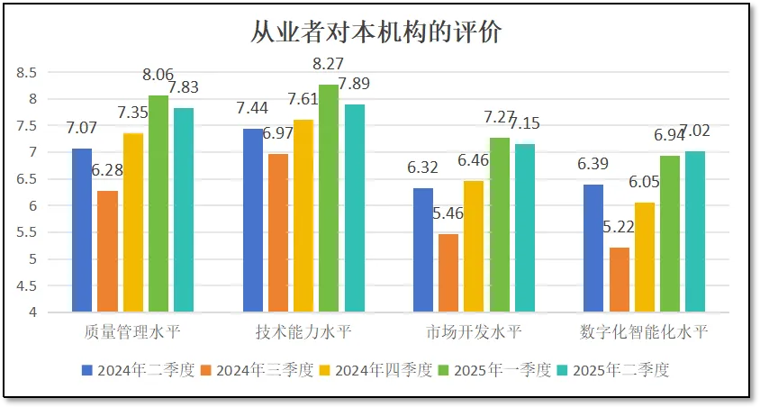 由上两图可见,在二季度末,从业者们对本机构的“质量管理水平”打分为7.83分,对“技术能力水平”打分为7.89分,对“市场开发水平”打分7.15分,对“数字化智能化水平”打分为7.02分。从这些数据来看,除了数字化智能化水平的分值略有提升外,其他三个指标均较一季度出现细微下降。说明随着经济形势趋稳,宏观发展方向看好,从业者们开始回头来关注本机构抓机遇、谋发展的能力。但由于将近年中,一些机构仍未调整发展战略、改进工作方式,引起内部人员的担忧,担心本机构不能把握机遇赢得先机。从分值高低来看,人们普遍对本机构的技术能力最有信心,对质量管理水平的信心次之,对市场开发水平和数字化智能化水平的打分相对较低。