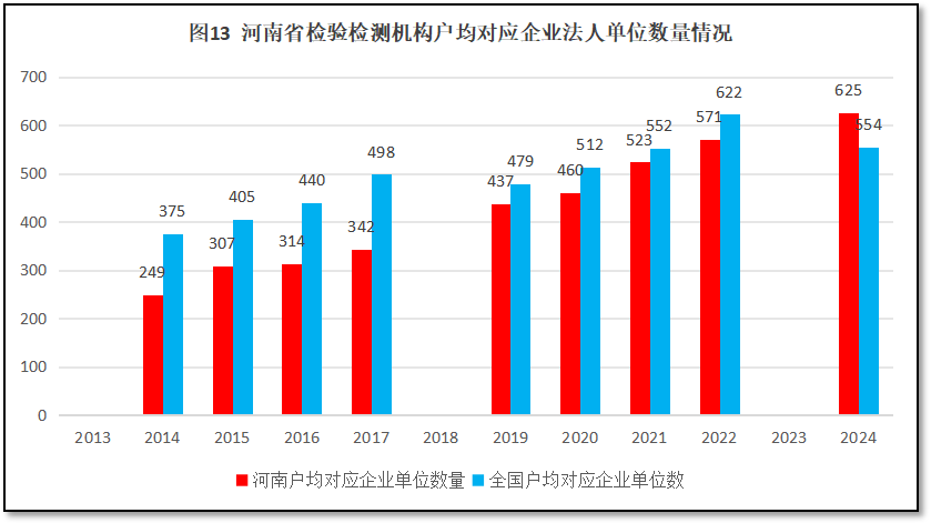 由图13可见,河南省检验检测机构户均对应的企业法人单位数量逐年增高,在2022年之前一直比全国平均水平低,但差距逐年减少。2024年,河南省检验检测机构户均对应企业法人单位数量首次超过全国平均数,达到625家,超过全国平均数554家约70家,预示着河南省检验检测行业发展可能迎来较好的发展阶段,理论上的客户资源增多,市场空间变大。
