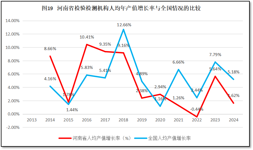 再来看河南省检验检测机构人均年产值增长率与全国人均年产值增长率的比较,如图19所示。