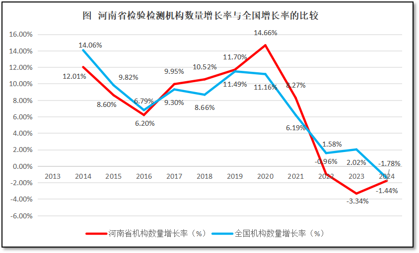 由图1可见,在2021年之前,河南省检验检测机构数量总体保持增长,但2021年之后开始转为逐年下降,最近四年检验检测机构数量持续“净减少”。2024年末,河南省的检验检测机构数是2931家,是2013年末的2.05倍,但已经比最高时2021年净减少了180多家机构。12年来,河南省检验检测机构数量的年均增速为6.89%。从年度增长率曲线来看,河南省检验检测机构数量的增长率在2016年之前逐年下降,在2016至2020年又逐年上升,并在2020年达到14.66%高点。2020年之后,增长率急转直下,到2022年已经降为负值,2023年降低更多,2024年度的增长率仍然为负数,虽然降幅略微减少,曲线有所回升,但总体仍然保持下降趋势。可以看到,河南省检验检测行业面临中经济下行的巨大冲击,已经开始出现明显的“萎缩”现象,不断有难以适应市场竞争的机构被淘汰。