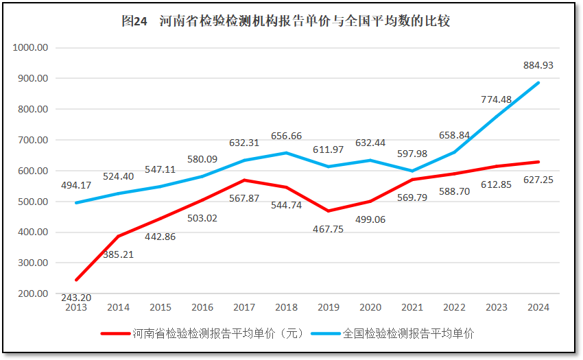 再来看河南省检验检测报告单价的情况,过去12年河南省检验检测报告单价与全国情况的比较,如图24所示。