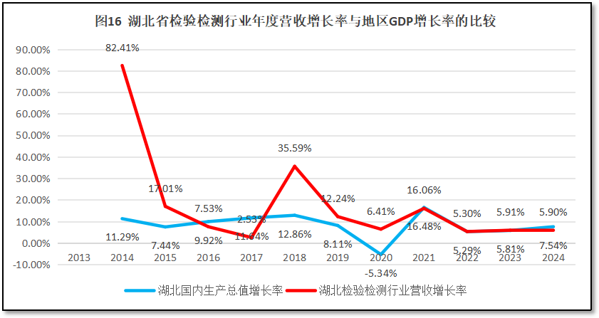 来看湖北省GDP年度增长曲线与湖北省检验检测机构年度营收总额增长曲线的比较,如图16所示。